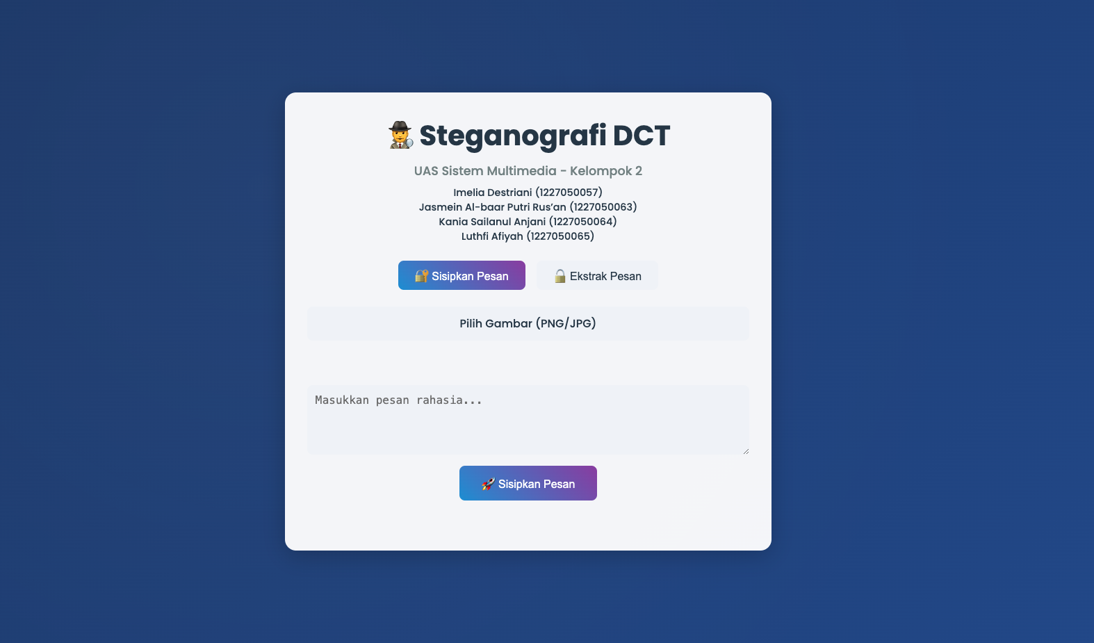A simple web app for embedding and extracting secret messages in images using Discrete Cosine Transform (DCT), built with Flask, HTML, CSS, and JavaScript.