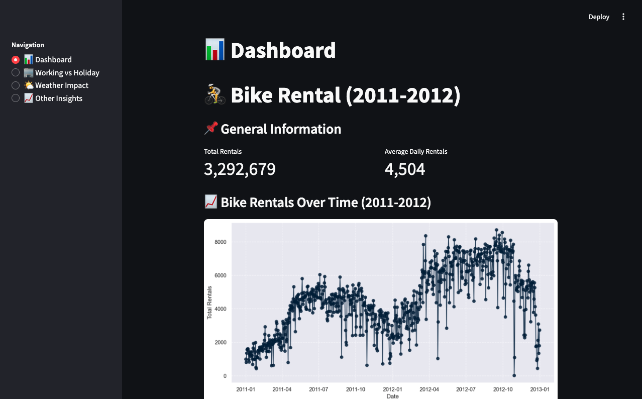 A Streamlit-based web dashboard for visualizing insights from processed datasets, built with Python and requiring day_clean.csv and hour_clean.csv.